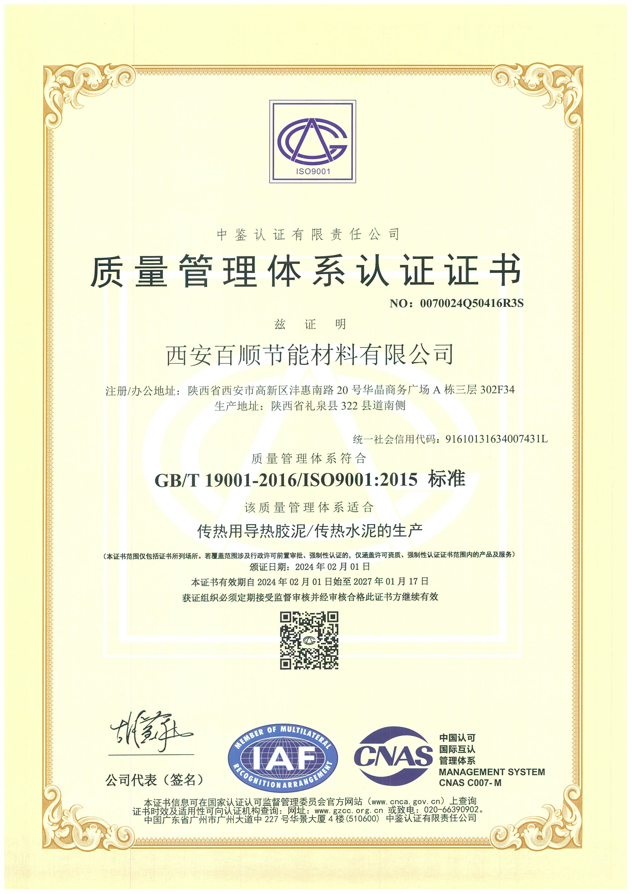 西安百顺节能材料有限公司成立于1998年,二十多年来,我们专心、专注于导热胶泥产品的研发、生产;企业通过ISO9001:2015质量管理体系认证,制定了Q/BS 001-2020《无机型导热胶泥》企业标准,经过不断的研发、优化,成功开发、生产、销售了针对不同工艺、不同材质、方便施工的JM-250、JM-600、JM-800、JM-1000系列导热胶泥,年生产能力2000吨;